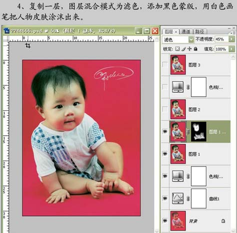 #p# 4、把刚才处理的图层复制一层,图层混合模式改为“滤色”,按Alt键加上图层蒙版,用白色画笔把人物皮肤部分涂出来。