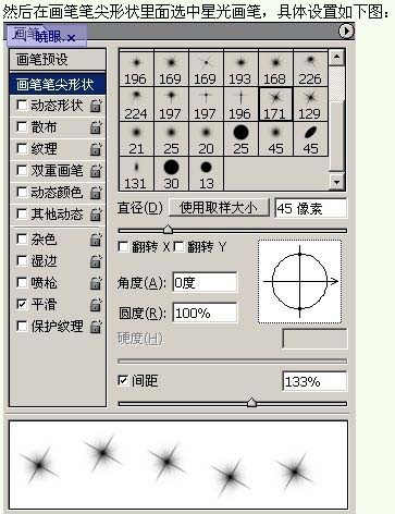 2、选择画笔笔尖形状,选择星光画笔,参数设置如下图。