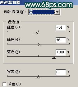 <图12> #p# 8、创建通道混合器调整图层,对蓝色进行调整,参数设置如图13,效果如图14。