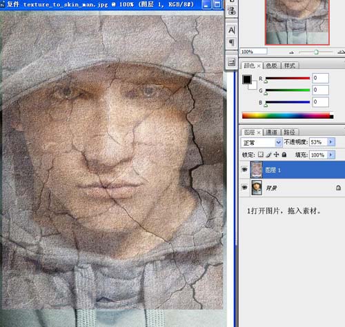 #p# 1、打开原图素材,再打开下图所示的纹理背景,把纹理图层拖进来。