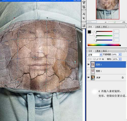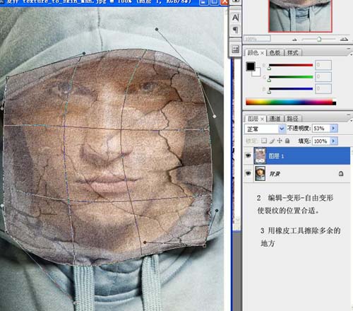 #p# 2、选择菜单:编辑 > 变形 > 自由变形,使裂纹的位置合适如下图所示。
