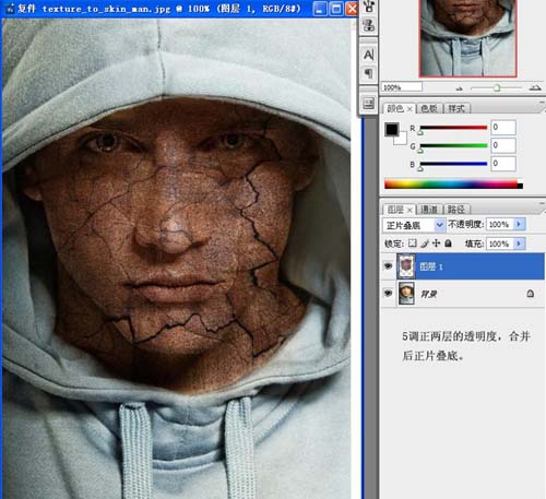 5、调整两层的透明度,然后把这两个纹理图层合并,图层混合模式改为“正片叠底”。