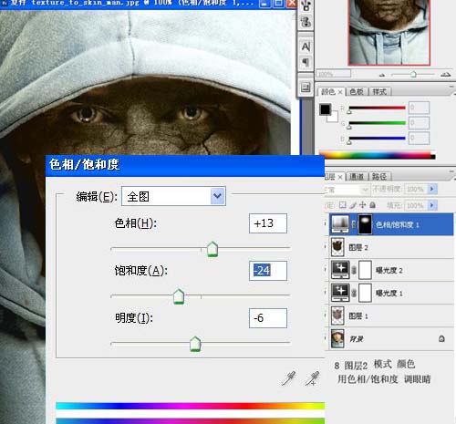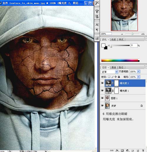 #p# 6、用橡皮工具擦出眼睛,创建曝光度调整图层来加深裂纹。