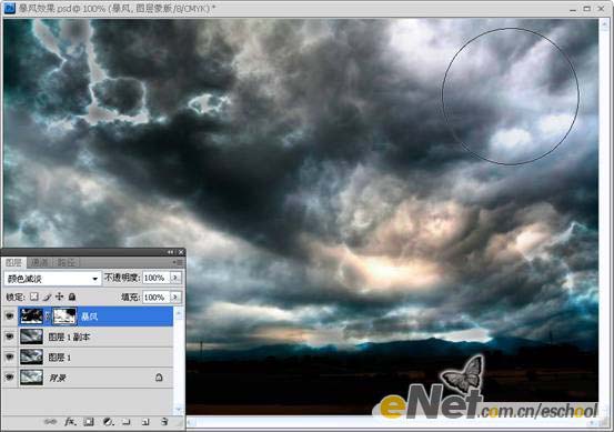 #p# 然后将【暴风】图层的混合模式改为【颜色减淡】,效果如下图所示。
