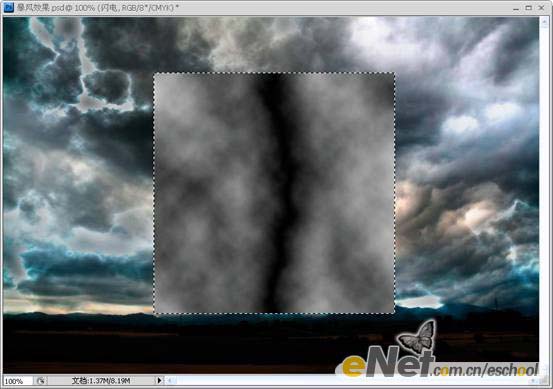 8、现在我们的“暴风雨”效果基本制作好了,下面我们再为其添加一些闪电。首先创建一个新层,并命名为【闪电】。在工具箱中选择【矩形选框工具】,按住【Shift】键不放,拖动鼠标制作一个如下图所示的正方形选区。