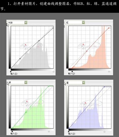 #p# 1、打开素材图片,创建曲线调整图层,做RGB、红、绿、蓝通道调节,参数及效果如下图。