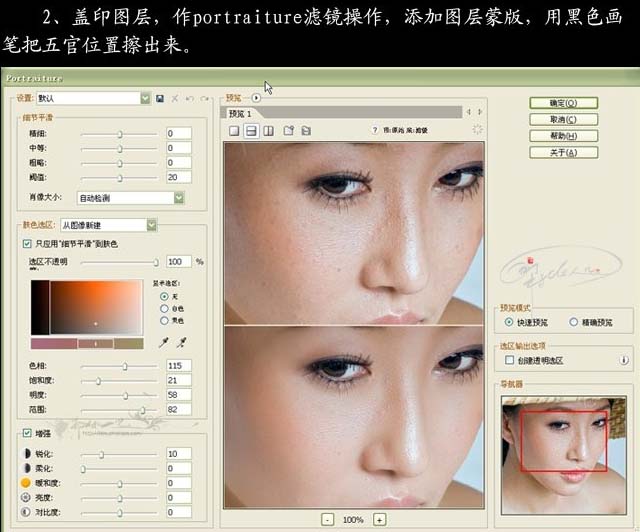#p# 2、新建一个图层,按Ctrl + Alt + Shift + E盖印图层,做portraiture滤镜操作,大家可以去网上下载,参数设置如下图,确定后加上图层蒙版,用黑色画笔把五官位置擦出来。