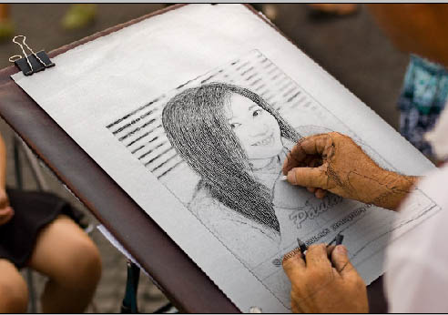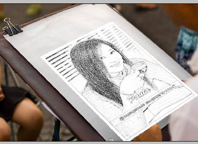教程分两部来做。先把人物素材转成素描画效果。然后再把素描画放到画板上去,调整好透视效果,擦掉不需要的部分即可。