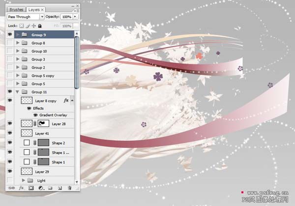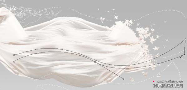 #p# 8、选择仿制图章工具,然后选一个叶子笔刷,在飘带尾部取样,仿制一层飘叶效果,然后在蒙板里结细节进行处理。