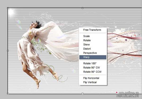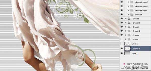 10、在此人物和飘带部分处理完成,可以把这个部分除灰色背景层的所有图层分成一个组,方便修改和查看接下来就是整体装饰部分,新建一层,然后用钢笔工具勾出一些线条,然后画笔描边。