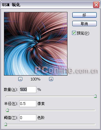 #p# 8、最后,我们除去图像中的一些模糊像素,锐化图像。首先合并图层,选择菜单“图层>合并可见图层”。再选择“滤镜>锐化>USM锐化”,参数设置如下,确定后完成最终效果。