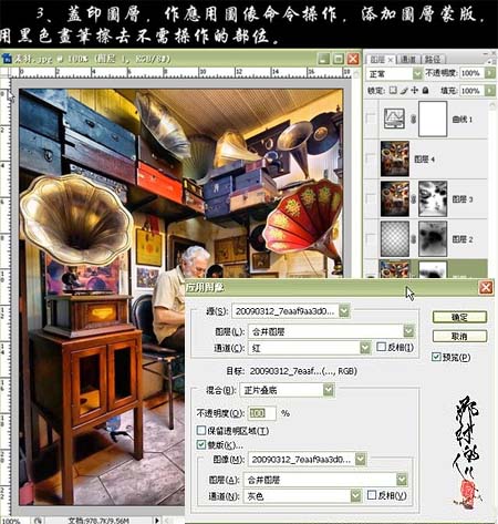 平面设计 > photoshop教程 > 照片处理 > Photoshop 室内照片柔和的暖色调 2009-03-19 01:52:53 脚本之家 3、新建一个图层,按Ctrl + Alt + Shift + E盖印图层,执行:图像 > 应用图像,参数设置如下图,确定后加上图层蒙版用黑色画笔擦掉不需要操作的部分。 4、新建一个图层,做透明到黑白径向渐变,添加图层蒙版,用黑色画笔涂掉不需要操作的部分。 上一页 1 2 3 45 6 下一页 阅读全文
