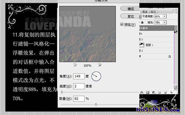 #p# 11、将复制的图层执行:滤镜 > 风格化 > 浮雕效果,参数设置如下图,确定后把图层混合模式改为“点光”,不透明度改为:88%,填充改为:70%。