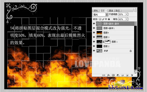 #p# 14、将拼贴图层混合模式改为“强光”,不透明度改为:50%,填充60%。表现出最后熊熊烈火的效果。