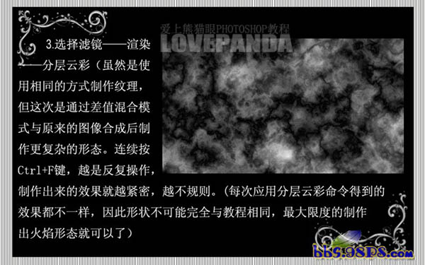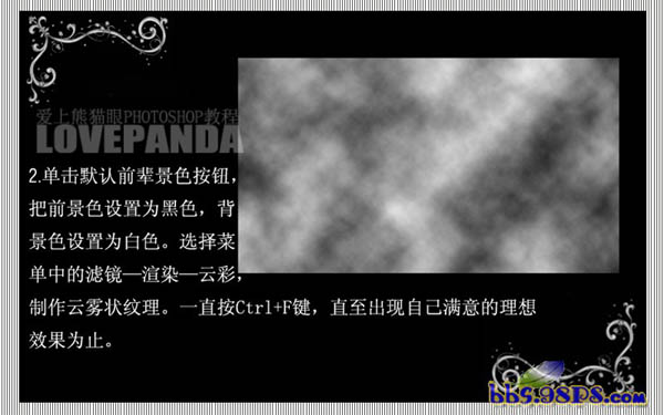 #p# 2、按字母“D”把前背景颜色恢复到默认的黑白,然后执行:滤镜 > 渲染 > 云彩,再按Ctrl + F调出自己满意的效果。