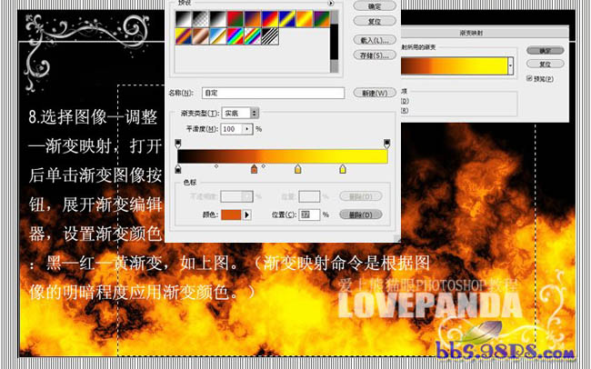 #p# 8、选择图像 > 调整 > 渐变映射,打开后单击渐变图像按钮,展开渐变编辑器,设置渐变颜色:依次为黑-红-黄渐变,如下图。