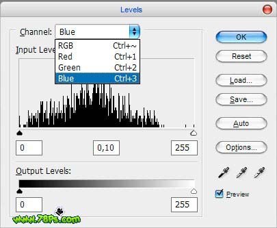 按CTRL+J复制为一个新的图层,按CTRL+L调整蓝通道的色阶,记住通道:蓝。