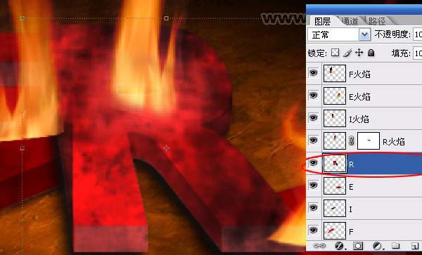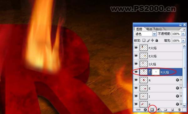 #p# 7、为了方便观察,将火焰改为对应字母的名字,以R字母为例,将R字母图层上方的火焰添加图层蒙版,将前景色设为黑色,画笔硬度为0,在图层蒙版上将火焰底部抹光滑。