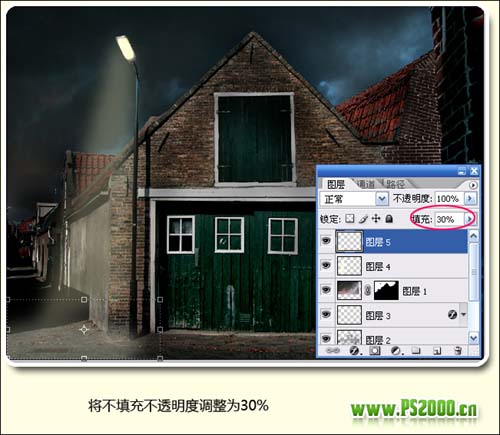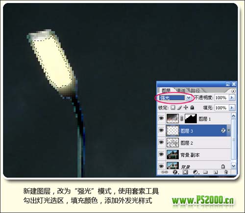 7、新建一个图层,图层混合模式改为“强光”,使用套索工具勾出灯光选区,填充淡黄色,然后双击图层调出图层样式,加点外发光效果。
