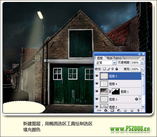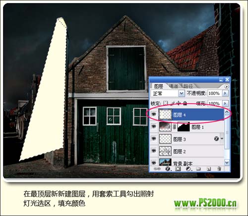#p# 8、在最顶层新建图层,用套索工具勾出照射灯光选区,填充淡黄色。