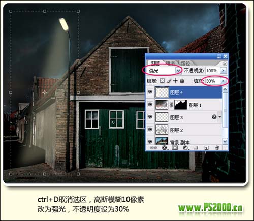 9、按Ctrl + D取消选区,执行:滤镜 > 模糊 > 高斯模糊,数值为10,然后把图层混合模式改为“强光”,图层不透明度改为:30%。