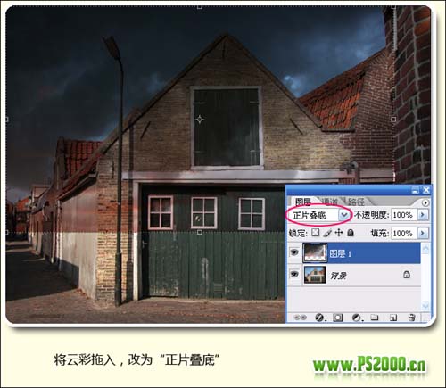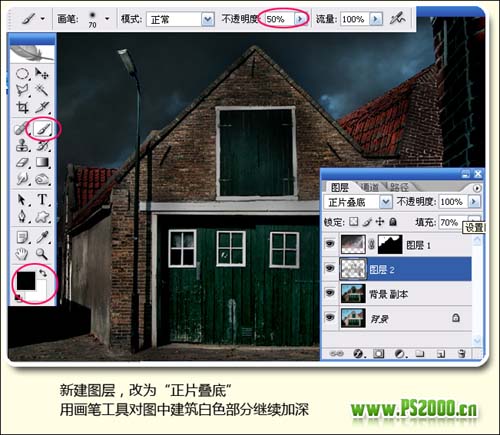 6、新建一个图层,图层混合模式改为“正片叠底”,用画笔工具对图中建筑白色部分继续加深。