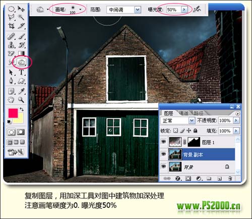 #p# 5、把背景图层复制一份,用加深工具对图中建筑物加深处理,注意画笔硬度为0,曝光度为:50%。
