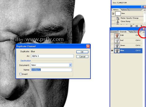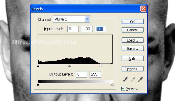 平面设计 > photoshop教程 > 合成特效 > photoshop 合成恐怖的树皮脸 2009-04-07 02:02:12 脚本之家 4、关闭树皮图层,打开通道面板,复制蓝色通道,生成Alpha 1。 5、对Alpha 1进行2像素的高斯模糊,然后用色阶调整对比度,数据如图,另存为“ Displace.psd ”文件。 6、返回到图层面板,显示树皮图层,对树皮图层进行 扭曲--置换 滤镜,数值为1,然后设置图层混合模式为:正片叠底。 上一页 1 2 34 5 6 7 8 下一页 阅读全文