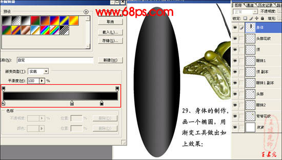 #p# 29、身体的制作,新建一个图层,画一个椭圆,用渐变工具做出如下效果。
