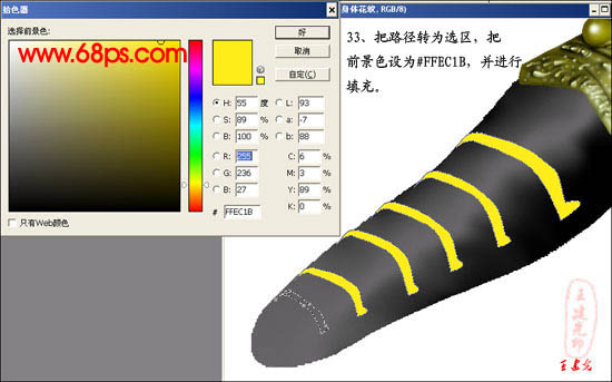 #p# 33、把路径转为选区,把前景色设为:#FFEC1B,并进行填充。