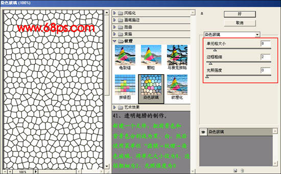 #p# 41、透明翅膀的制作,新建一个文件,把前景和北京色设置为黑白。然后执行:滤镜 > 纹理 > 染色玻璃,将单元大小设置为8,边框粗细设为2,光照度设为0。