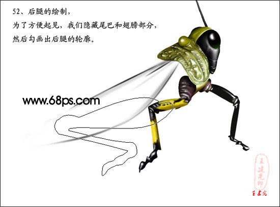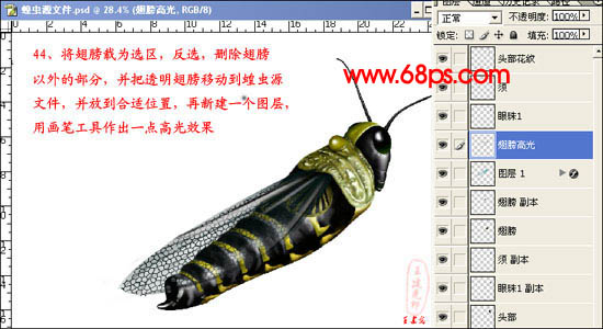 44、将翅膀载为选区,按Ctrl + Shift + I反选,删除翅膀以外的部分,并把透明翅膀移到蝗虫源文件,并放到合适位置,再新建一个图层,用画笔工具做出一点高光效果。