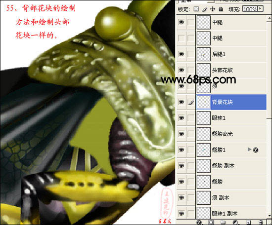 55、背部花块的绘制方法和绘制头部花块一样。