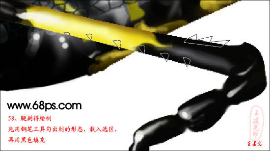 58、腿刺的绘制,先用钢笔工具勾出刺的形状,载入选区再用黑色填充。