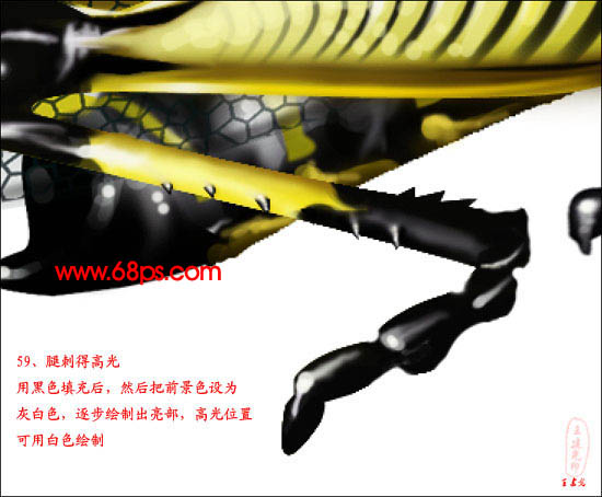 59、腿刺的高光,用黑色填充后,然后把前景色设置为灰白色,逐步绘制出亮部,高光位置可用白色绘制。