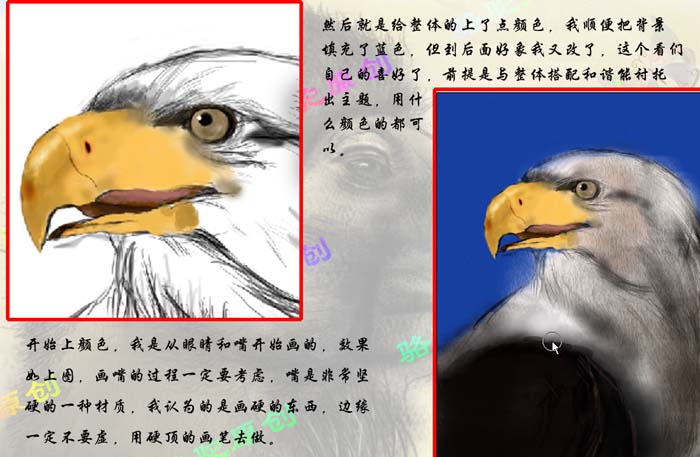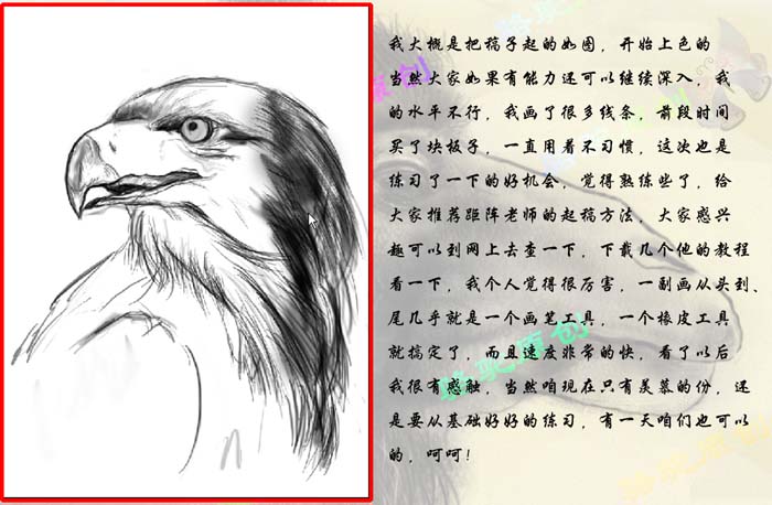 平面设计 > photoshop教程 > 矢量手绘 > photoshop 鼠绘一只彩色羽毛的鹰 2009-04-24 00:54:46 脚本之家 2、大致线稿效果如下图,如果觉得简陋还可以 继续深入刻画线稿。自己满意后就开始上色。 3、开始上色,我是从眼睛和嘴开始画的,效果如下图左。画嘴的过程一定要考虑嘴是非常坚韧的一种材质,选择画笔的时候笔刷需要尖利一点。4、整体上色,基调以黑灰为主,羽毛部分比较多上色的时候需要慢慢涂。上色后适当把背景涂上蓝色。 上一页 1 23 下一页 阅读全文