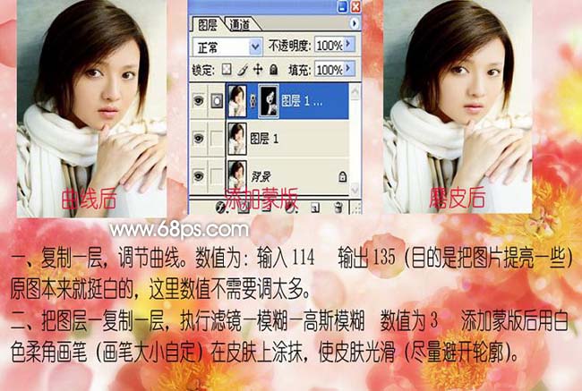 #p# 1、打开原图,把背景图层复制一层,按Ctrl + M对副本调整曲线,输入:114,输出:135,目的是把图片提亮一些。2、把副本复制一层,执行:滤镜 > 模糊 > 高斯模糊,数值为3,确定后按住Alt键加上图层蒙版,用白色柔角画笔在皮肤上涂抹,使皮肤光滑。