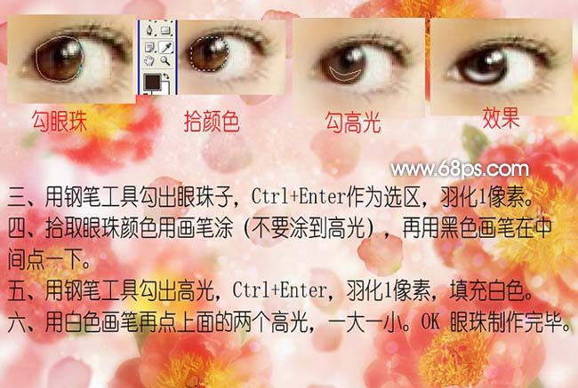 9、用加深工具加深眼角以及眼白周围,用减淡工具减淡眼角,这里要仔细一些。