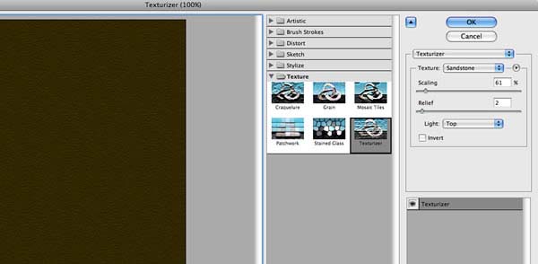 10、按住Command键(Mac)或是Ctrl键(PC),再点击图层的缩略图,生成这些图层的选区。将所有白色对象部分选择上,生成一个新的图层并添充白色,执行“滤镜”/“纹理”/“纹理化”命令。