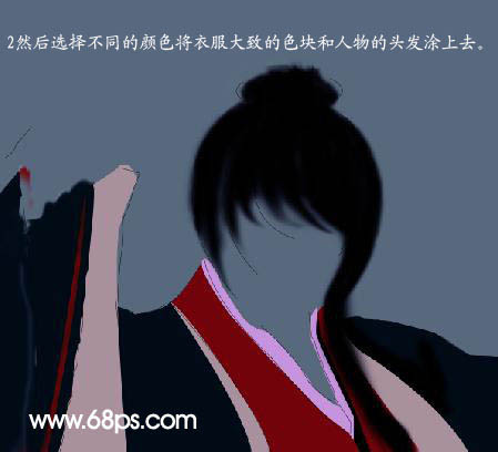 #p# 2、选择不同的颜色将衣服大致的色块和人物头发涂上。