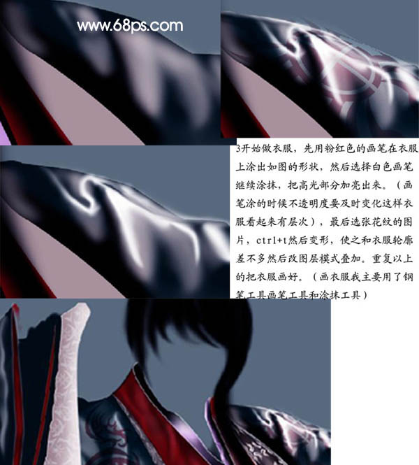 3、开始制作衣服,先用粉红色的画笔在衣服上涂出如下图的形状,然后选择白色画笔继续涂抹,把高光部分加亮出来。画笔涂的时候不透明度要及时变化,这样衣服看起来有层次。最后选张花纹图片,拖进来,按Ctrl + T变形,使之和衣服轮廓差不多,再把图层混合模式改为“叠加”,重复以上的操作吧衣服画好(画衣服主要用到的工具有钢笔,画笔及涂抹工具)。