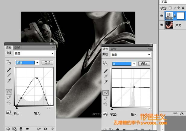 平面设计 > photoshop教程 > 照片处理 > photoshop 巧用曲线调出人物照片强对比搞质感肤色 2009-04-29 02:46:17 脚本之家 3、曲线图层混合模式改为颜色,调整蓝通道给全图上色。RGB模式下调整完成,(当然不用颜色模式也能得到一样的效果,但用颜色模式可以更容易的调整颜色而不受明度和饱和度的干扰。如果习惯了,你一定会喜欢图层混合模式强大的功能)。 4、三层曲线,三种不同的混合模式得到这么酷的效果,简单吧,怎么,还嫌复杂,好!我还有更便捷的,把图转到Lab模式,轻松L通道调整光影,A通道调到0,B通道上一点黄色。一层曲线搞定。在Lab模式下,曲线的发挥空间比会更强大,喜欢的可以试试。 最终效果。 上一页 1 2 3下一页阅读全文