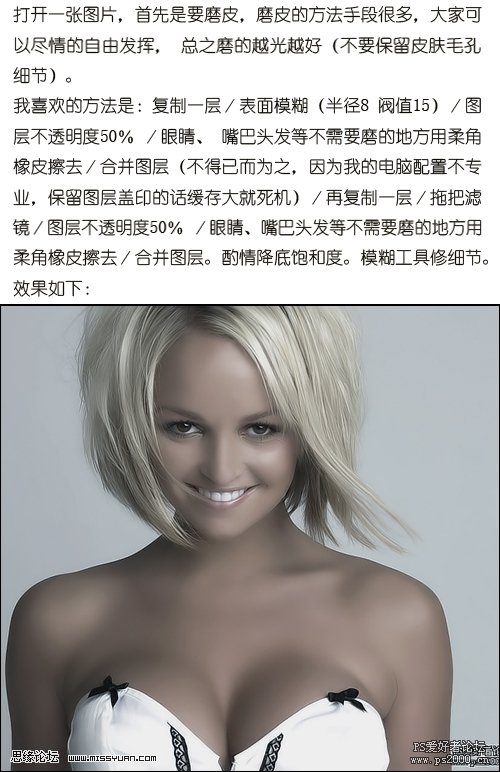 平面设计 > photoshop教程 > 照片处理 > Photoshop 美女油光质感肤色 2009-05-02 19:21:32 脚本之家 1、打开原图素材,首先是磨皮,磨皮的方法有很多,大家可以尽情的自由发挥,种植磨的越光越好。我喜欢的方法是,把背景图层复制一层,执行:滤镜 > 模糊 > 表面模糊(半径为8,阈值15),然后把图层不透明度改为:50%,眼睛、嘴巴头发等不需要磨的地方用柔角橡皮擦去。 2、新建一层填充黑色,图层混合模式改为“颜色减淡”,用画笔24不透明度设为:25,流量33,颜色为白色在图片需要加亮高光的区域涂抹,效果如下图。 上一页 1 23 4 5 下一页 阅读全文