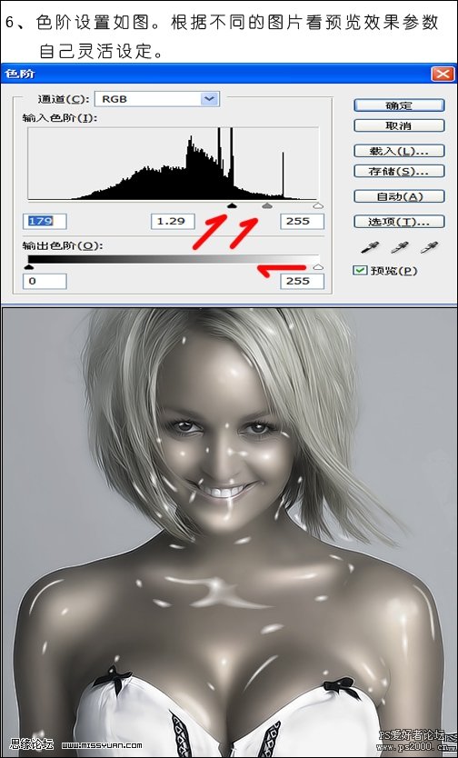6、按Ctrl + L调整色阶,参数设置如下图,需要根据不同的图片自由设定。