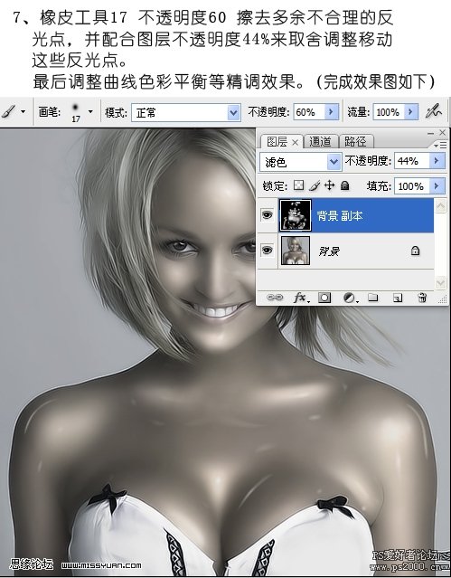 #p# 7、用橡皮工具17,不透明度60,擦去多余不合理的反光点,并配合图层不透明度44%取舍调整移动这些反光点。最后调整曲线及色彩平衡等完成最终效果。
