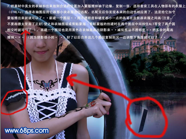 7、把素材中美女的衣袖抠出来放到合适的位置,加上蒙版用黑色画笔擦掉边缘,复制一张,选择套索工具在人物原有的衣服上,选择衣袖图层用它跟那小块衣服进行匹配,匹配完后你发现本来的白边也相应黑了,这时给它加个蒙版擦出来就可以了。