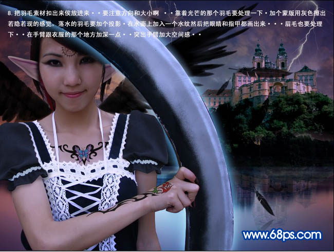 8、把羽毛素材抠出来拖进来。多复制几层,要注意改变方向和大小。靠着光芒的那个羽毛要处理一下,加个图层蒙版用灰色擦出透明感觉。落水的羽毛要加个投影。在水面上加入一个水纹然后把阴茎和指甲都画出来。眉毛也要处理下。在手臂跟衣服的那个地方加深一下出处手臂加大空间感。
