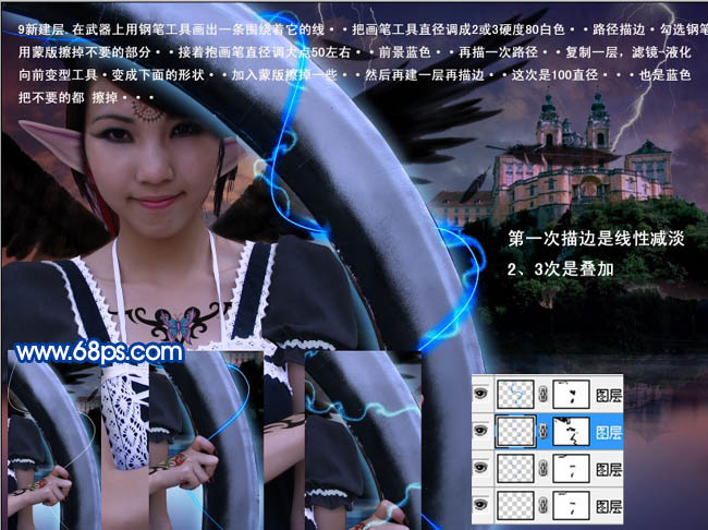 <图20> #p# 9、新建一个图层,在武器上用钢笔工具画出一条围绕它的线。把画笔工具直径设为2或3,硬度80,颜色为白色。右键路径选择路径描边,选择画笔,勾选模拟压力。加上图层蒙版用黑色画笔擦掉不需要的部分。接着把画笔直径调到50左右,前景颜色设置为蓝色,再一次路径描边。描好后复制一层,执行:滤镜 > 液化,用向前变形工具变成下面的形状。加上蒙版擦掉一些。然后再新建一层再描边,这次直径为100。也是蓝色。确定后把不需要的部分擦掉。