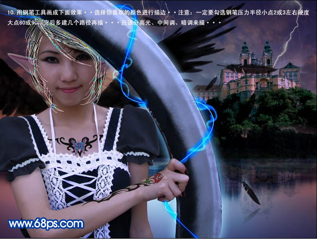 8、把羽毛素材抠出来拖进来。多复制几层,要注意改变方向和大小。靠着光芒的那个羽毛要处理一下,加个图层蒙版用灰色擦出透明感觉。落水的羽毛要加个投影。在水面上加入一个水纹然后把阴茎和指甲都画出来。眉毛也要处理下。在手臂跟衣服的那个地方加深一下出处手臂加大空间感。