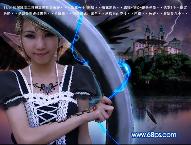 11、用减淡/加深工具吧高光暗调画好。新建一个图层,填充黑色,执行:滤镜 > 渲染 > 镜头光晕,选择第3个。确定后调整色阶,把背景弄成纯黑色。再把图层混合模式改为“滤色”,然后自由变化,压扁放好,多复制几层。